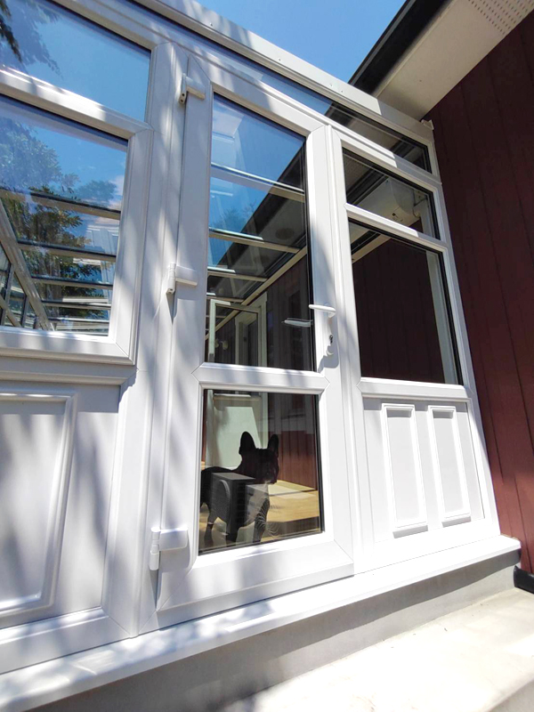 住宅屋根下屋より下側にコンサバトリーのガラスが入るように