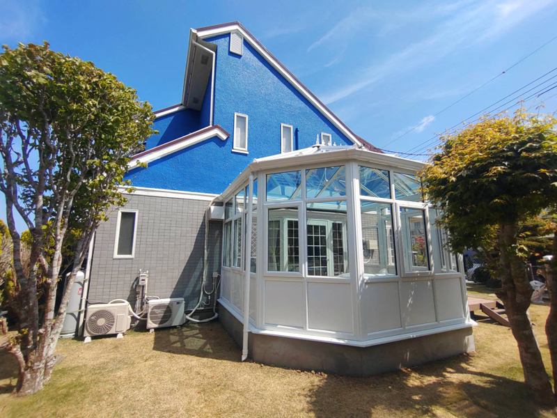 ブルーの外壁のお住まいとホワイトのコンサバトリーの調和。
